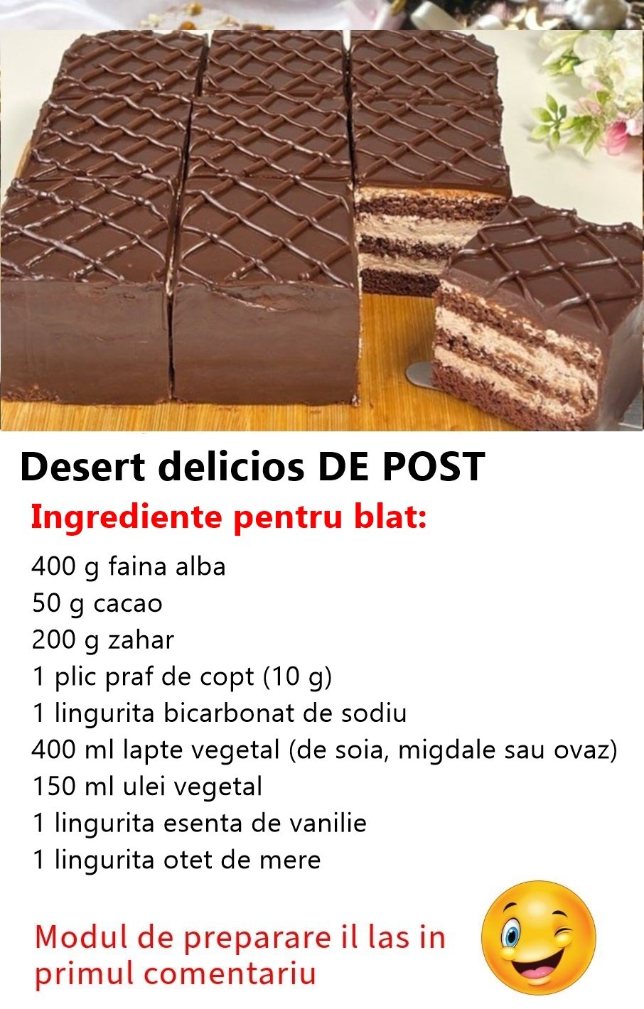 O rețetă delicioasă, fără ingrediente de origine animală, perfectă pentru iubitorii deserturilor vegane. Această prăjitură combină blatul pufos de cacao cu o cremă bogată și o glazură de ciocolată neagră.