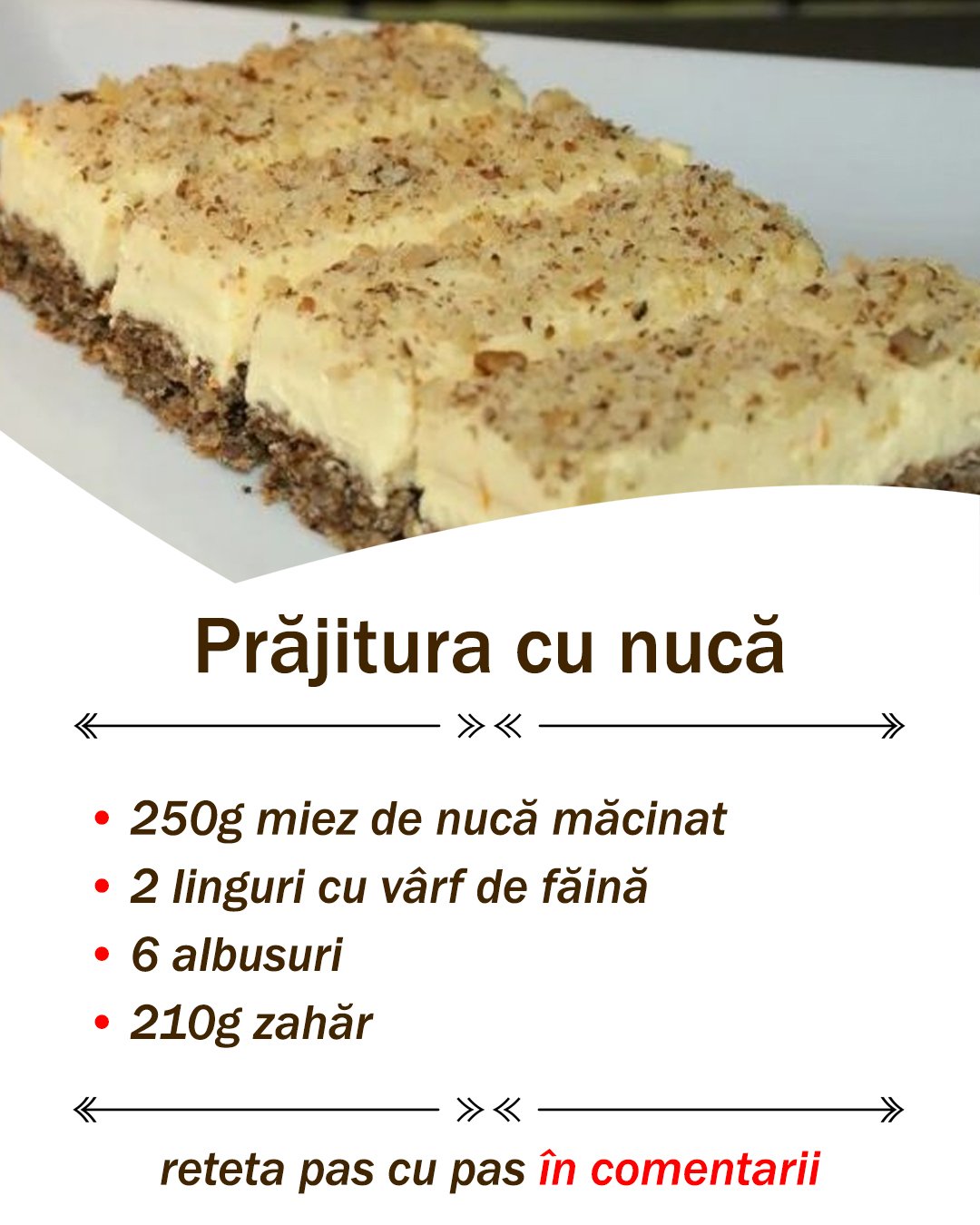 februarie 2, 2025februarie 2, 2025Blog Ingrediente pentru blat: Ingrediente pentru cremă: Mod de preparare: Prepararea blatului de nucă Prepararea cremei Vă dorim poftă bună și spor la gătit!