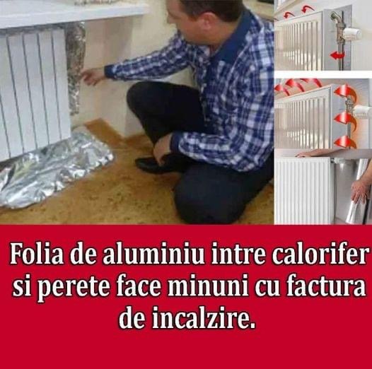 Folie de aluminiuVrei sa amplifici efectul caloriferelor tale? Avem un sfat simplu pentru tine. Ai nevoie doar de o rola de folie de aluminiu. Desfasurati o bucata de aluminiu de aceeasi lungime ca si radiatorul si lipiti-o in spatele caloriferului cu niste banda adeziva. Repetati acest proces la toate caloriferele dvs. Caldura de la calorifer se va reflecta pe folia de aluminiu, ceea ce inseamna ca, in loc sa scape prin pereti, aerul fierbinte se va reflecta inapoi in camera. Trucul este atat de eficient incat da impresia ca in camera functioneaza doua calorifere in loc de unul! Cand casa ta se incalzeste mai repede, termostatul se opreste si mai repede (pana cand trebuie sa se porneasca din nou). Ceea ce inseamna ca economisesti si bani.