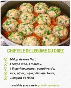 Chiftele de legume cu orez – o rețetă simplă, delicioasă și perfectă pentru post! 🌱✨ Dacă sunteți în căutarea unei alternative sănătoase și sățioase, aceste chiftele sunt exact ce aveți nevoie. Combinația de orez și legume oferă o textură plăcută, iar pesmetul ajută la obținerea unei cruste crocante și aurii. Se prepară rapid și sunt extrem de versatile – le puteți servi alături de o salată proaspătă, un sos de roșii sau chiar ca aperitiv la mesele de familie.