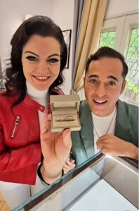Atunci când au văzut verighetele pentru prima oară, emoțiile au fost la cote maxime. Le-au împărtășit momentul și cu urmăritorii lor online. Au optat pentru modele rafinate – pentru ea, o verighetă din aur alb cu două rânduri de diamante albastre și transparente, iar pentru el, una cu diamante negre. „Sunt imperiale!!!”, a scris Dinu Maxer pe rețelele sociale.