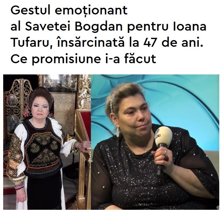Vestea că fiica Andei Călugăreanu, Ioana Tufaru, este însărcinată la aproape 48 de ani a luat întreaga țară prin surprindere. Nimeni nu se aștepta la un asemenea anunț din partea ei, însă există și persoane care s-au bucurat să audă că va deveni mamă pentru a doua oară. O celebră artistă i-a făcut o promisiune, în mod public, legată de momentul în care se va naște bebelușul. Află ce gest emoționant are de gând să facă Saveta Bogdan pentru cel de-al doilea copil al Ioanei Tufaru!
