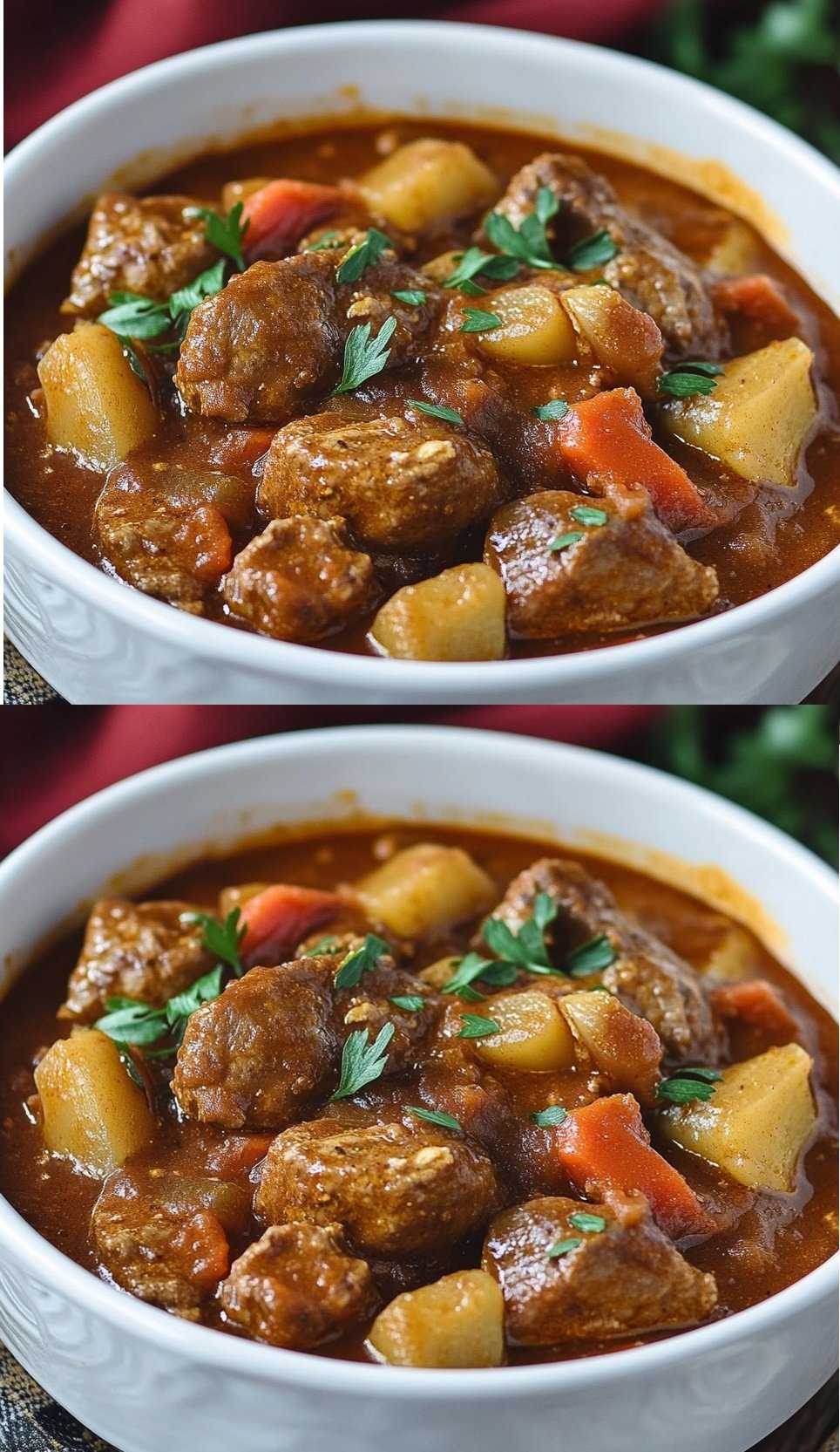 Gulașul se servește cald, alături de pâine proaspătă, mămăligă sau chiar tăiței de casă. Pentru un gust autentic, asortează-l cu un pahar de vin roșu!