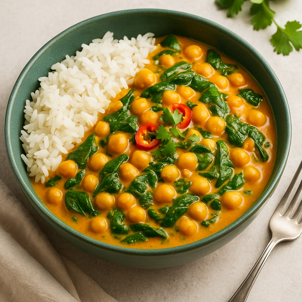 Datorită ingredientelor simple și accesibile, acest curry este ușor de preparat, iar aroma finală este în același timp caldă, ușor picantă și intens parfumată. Laptele de cocos oferă o textură catifelată, năutul asigură consistență și sațietate, iar spanacul proaspăt aduce prospețime și culoare. Preparatul este ideal pentru prânz sau cină, se păstrează foarte bine și poate fi refăcut în cantități mari pentru întreaga familie.