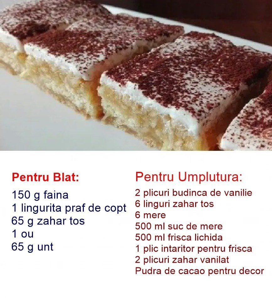 Această prăjitură delicioasă combină un blat crocant cu o umplutură de mere și budincă de vanilie, acoperită cu un strat generos de frișcă și pudră de cacao. Este un desert perfect pentru orice ocazie, aducând un echilibru plăcut între dulceața vaniliei și prospețimea merelor. Prepararea acestei prăjituri este simplă și rapidă, iar rezultatul final va impresiona cu siguranță pe oricine.