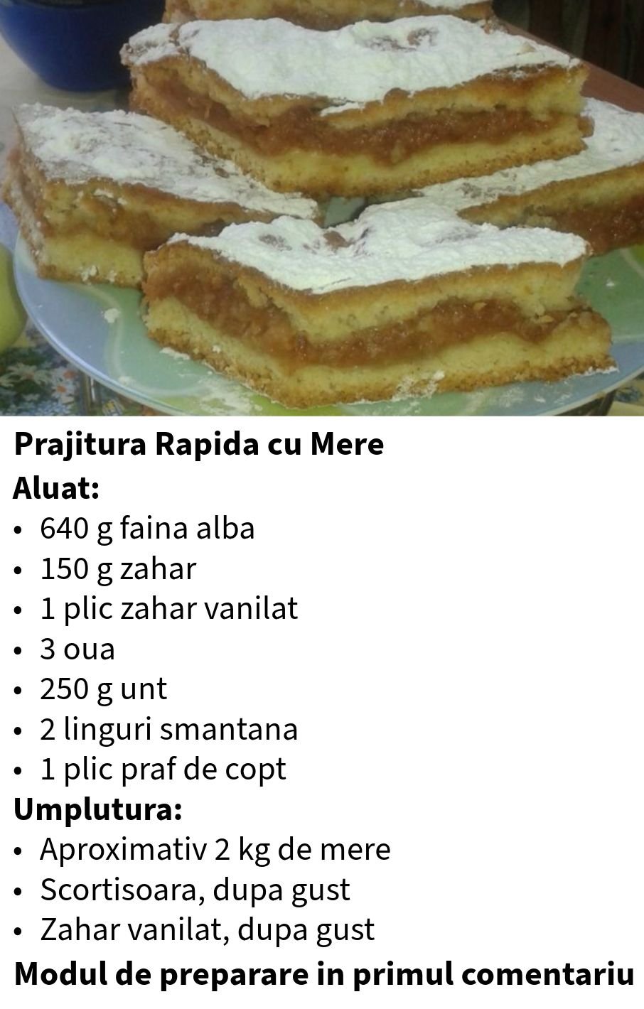 O prajitura simpla si rapida, cu un strat generos de mere, perfecta pentru momentele cand vrei ceva dulce fara prea mult efort. Se prepara din ingrediente simple si este ideala pentru intreaga familie.