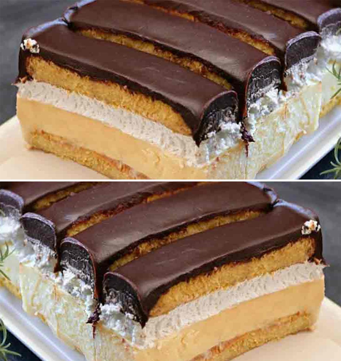 Apoi puneti piscoturile ramase inmuiate in lapte peste frisca batuta si turnati peste glazura de ciocolata, pe care ati pregatit-o din smantana de gatit fierbinte si ciocolata neagra sparta. Pune desertul la frigider pentru cateva ore (ideal peste noapte) pentru a se solidifica. Serviti desertul terminat cu fructe proaspete, de exemplu (capsuni, banane, afine) sau doar cu o ceasca de cafea, cacao sau ceai.